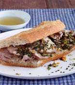 Thinly slice the pork on a slight angle. Dip the slices in the stock and pile them onto the bottom of a bread slice. Spoon the orange rosemary stuff on top and serve with the remaining stock for dipping.