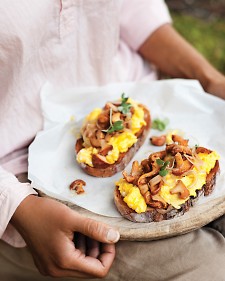 Toast bread slices, and spread with butter. Season eggs with salt and pepper. Melt remaining 2 tablespoons butter in skillet over medium-high heat. Cook eggs, stirring with a rubber spatula, until just set. Spoon scrambled eggs, then mushrooms, over toasts. Garnish with basil.
