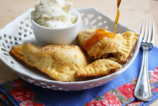 Let the caramel cool down a little. Drizzle over the baked turnovers and serve.