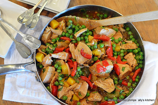 Cover tightly with a lid. Cook in a preheated 350°F oven about 1 hour. Remove and let cool about 15 minutes then cut the meat into chunks and add peas, parsley, peppers and drained 4-ounce cup of diced peaches. Bon appetito!