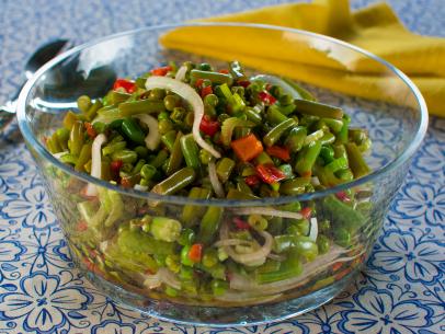 Add to a bowl the green beans, peas, celery, pimientos, onions and bell peppers. Pour the vinegar mixture over the vegetables, cover with plastic wrap and marinate in the refrigerator for 24 hours.