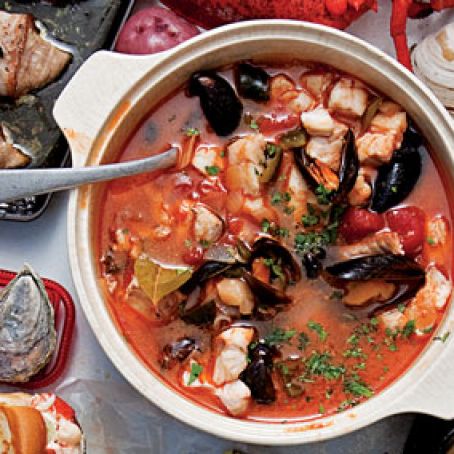 Transfer fish, cornmeal side up, to 4 shallow bowls. Arrange clams, mussels and sausage around fish. Top with remaining soup. Sprinkle with parsley.