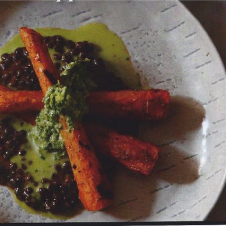 Whole Roasted Carrots with Black Lentils and Green Harissa