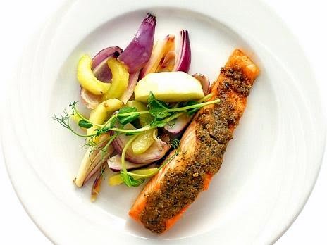 3. Grönsaker: Skala och dela gurkan på längden, skrapa ut kärnorna och skär den i sneda bitar. Kärna ur äpplena och dela dem i klyftor. Skala och klyfta rödlöken. Fräs gurkan och rödlöken i lite smör, lägg i äppelklyftorna efter någon minut. Låt dem inte fräsa för länge, de ska behålla sin krispighet. Krydda med salt och peppar. Servera genast till laxen.