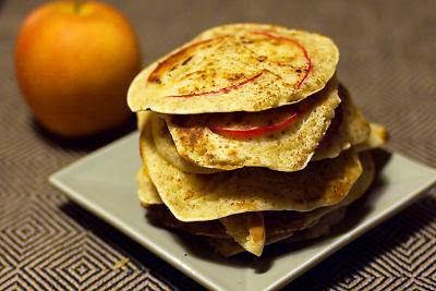 Vispa upp ägg tillsammans med mjölk och smält smör. Vispa ner mjöl, bakpulver och salt. Tillsätt eventuellt socker. Häll upp små plättar i stekpannan och lägg på ganska tunt skivade äpplen innan smeten gräddats. Pudra över kanel på äppelsidan, vänd plättarna och grädda så att det får fin färg.