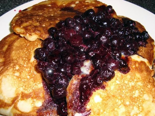 Fluffy buttermilk pancakes topped with a delicious blueberry compote