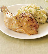 Meanwhile, slice the remaining 2 garlic cloves. Combine in a saucepan with the celery root. Cover with cold water by 1 inch, season with salt and bring to a boil. Lower the heat and simmer for 5 minutes. Add the potatoes, bring to a boil, reduce to a simmer and cook until the potatoes and celery root are tender, 15 to 20 minutes. Drain well and return to the pot; heat over medium heat until dry, about 1 minute. Remove from the heat, then add the milk, mustard and remaining 4 tbsp. butter; coarsely mash. Stir in the scallions and season with salt and pepper. Drizzle the lemon juice over the chicken and serve with the mash.
