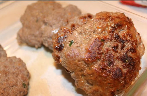 Take a golf ball sized piece of the beef mixture, make it round, and then flatten it.
