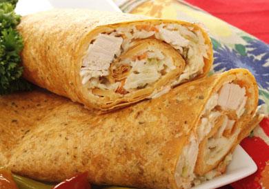 Place 2 cheese slices in a single layer on 1 side of each wrap; top each evenly with about 3/4 cup chicken mixture. Roll up jellyroll-style; wrap in plastic wrap, twisting ends of wrap to seal. Chill up to 8 hours, if desired. Cut in half to serve.
