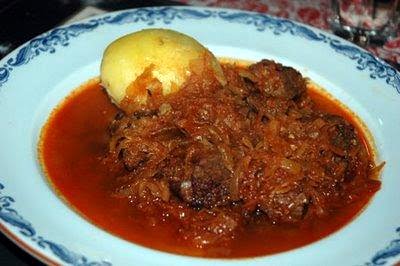 Halvera skiva löken och smörfräs. Bryn köttet väl på hög värme. Ta inte i allt köttet i pannan utan lite i taget. Häll köttet i en stekgryta. Ta lite av vattnet i pannan och häll sedan över det i grytan. Stek resten av köttet och gör om proceduren. Pressa vitlöken över köttet. Tillsätt resten av alla ingredienserna utom surkålen och koka 1 timme. Skölj surkålen under rinnande vatten, tillsätt och koka ytterligare ½ timme. Servera med potatis, färsk pasta typ tagliatelle eller italienska gnocci av potatis och mjöl.