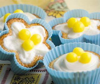 In a bowl, combine all ingredients except lemon drops. Beat with an electric mixer on low speed for 3 minutes. Fill paper-lined muffin cups 2/3 full. Bake at 350 degrees for 22 minutes, or until a toothpick tests clean. Frost with Cream Cheese Frosting; garnish with lemon drops, if desired.