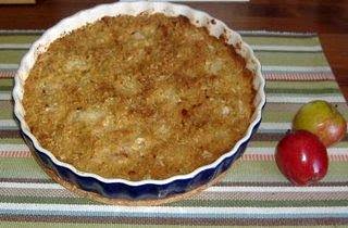 Hacka mandeln lite halvgrovt. Blanda alla de torra ingredienserna. Smält smöret och låt det svalna. Blanda i smöret i de torra ingredienserna. Skala och kärna ur äpplena. Skär dem i småbitar och sprid ut dem i en smord pajform. Fördela degen över äpplena och baka pajen ca 30 minuter i 200 graders ugn. Servera rumstempererad eller lätt ljummen med vaniljsås.