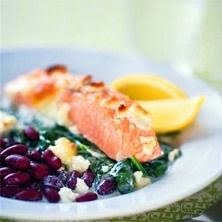 1. Sätt ugnen på 200 grader. Ta fram en rymlig ugnssäker form och häll olivolja i botten. Skölj spenaten och ta bort de grövsta stjälkarna. Koka upp vatten i en stor kastrull och lägg i spenaten. Låt den ligga i max 1/2 minut. Ta upp den och skölj i ett durkslag med iskallt vatten. Låt spenaten rinna av och lägg den i formen. Lägg laxen ovanpå spenaten. Strö over salt och lite vitpeppar.