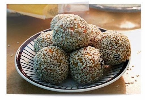 Forma små bollar som är så där 3 cm i diamter med hjälp av en blöt sked och rulla dem i sesamfrön. Här är det en fördel om bollen är lite blöt fortfarande. Platta till dem försiktgt med händerna så att de är mer platta än runda och stek på medelvärme några minuter på varje sida så att de får lite färg. Släng sedan in dem i ugnen, ca 200 grader i 10 min så att de blir genomsteka. Självklart går det att steka längre i stekpannan också men jag föredrar att slänga in saker i ugnen.