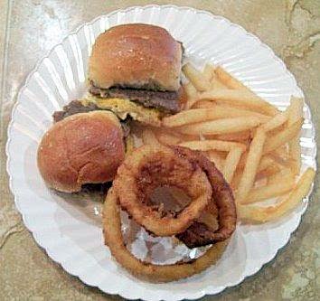 ** While this cooking is going on, deep fry your french frieas and onion rings in crisco oil and keep warm.. Also prepare your dinner rolls, by opening each roll, placing the face side of the bottom half of the roll face side down on a cutting board and then topping with the top of the roll, right side up. Repeat with all dinner rolls this way...