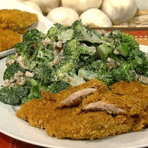 Place the corn flake crumbs in another large bowl. Dip the chicken into the crumbs pressing so the crumbs adhere.
