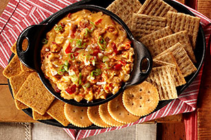 SET cast iron griddle pan over high heat. Brush onions and peppers with a little oil and grill 2-3 minutes so they are nicely charred. Season with salt and pepper. Transfer to a cutting board and roughly chop vegetables. Fold into the cheese mixture along with green onions and stir. Garnish with paprika and more green onions. Serve with crackers.