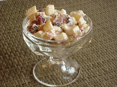 Sacar las manzanas y escurrirlas. Revolverles la crema, pasas, piñas y nueces picadas