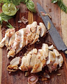 Transfer chicken and reserved pan juices to a bowl. Toss with basil and remaining tablespoon lime juice.