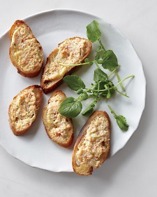 - 1/2 medium baguette, sliced into 20 thin slices (less than 1/4 inch thick)