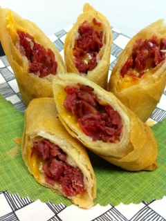 Place about 2 Tbsp. beef strips and 1 Tbsp. shredded sharp cheese along one corner of spring roll wrapper. Shape into about 2-inch stick. Roll tightly, folding in wrapper ends while rolling. Brush edges lightly with egg york to seal the egg roll closed. Repeat with remaining filling.