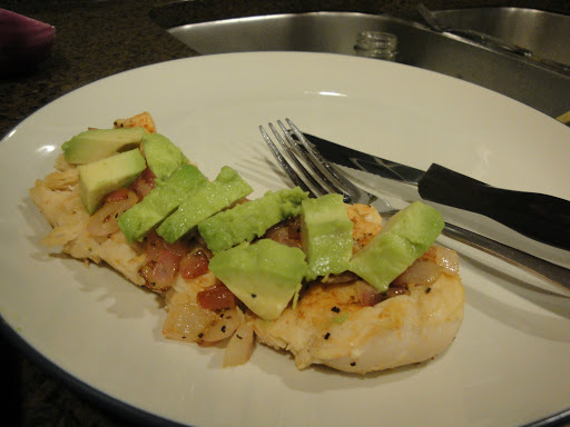 3. Meanwhile, in a medium bowl, combine onion and lime juice; set aside. Just before serving, fold avocado chunks into onion mixture; season with salt and pepper. Serve chicken topped with salsa.