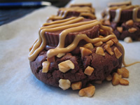 5. Press a frozen peanut butter cup into the center of each cookie immediately upon removing them from the oven. Press cookies up against peanut butter cup if desired for appearance, but do not touch the peanut butter cup again since it is now melted, it must remain intact. Cool completely.