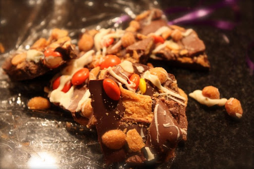 Sprinkle Skor bits over top pressing lightly into the chocolate.