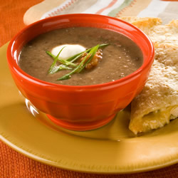 "Black beans, salsa, veggie broth and cumin are tossed into the blender. Transfer to a pot and heat until warm and bubbly. Serve with a dollop of sour cream and a sprinkling of green onion."