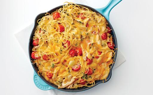 Turn off heat and slowly stir in half the cheeses, about ¼ cup at a time, until melted into sauce. Stir in diced vegetables, along with cumin, cayenne, cilantro, and lime juice. Add salt and pepper. Pour sauce into cooked spaghetti and stir in shredded chicken. Top with remaining cheeses. Bake, uncovered, 20 minutes or until brown and bubbling. Sprinkle with cilantro.