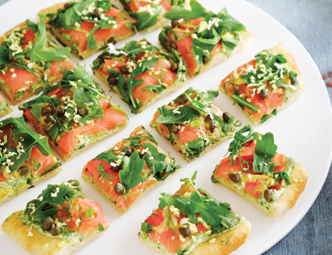1. Bake flatbread according to package directions. In a food processor, blend cream cheese, 1 cup (250 mL) arugula and lemon juice until smooth. Evenly spread cream cheese mixture on prepared flatbread. Place smoked salmon in a single layer on flatbread, drizzle with honey mustard and top with remaining arugula, dill, green onion, capers and egg. Cut into 16 small squares and sprinkle pepper overtop. Serve immediately.
