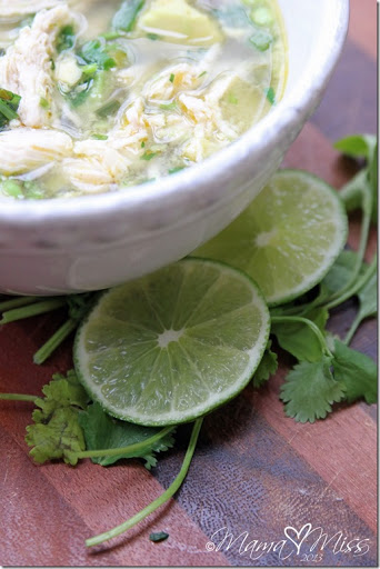 Layering in separate bowls; Fill each bowl with shredded chicken, diced avocado, chopped green onions (from the remaining 1/2 cup), and cilantro. Next, ladle the chicken broth onto the layered chicken in each bowl. Serve each bowl with a lime wedge.