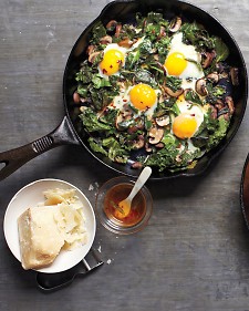 Make the eggs and greens: Heat a large, heavy skillet (preferably cast iron) over high heat. Swirl in oil. Cook mushrooms with 1/2 teaspoon salt until golden and tender, 4 to 5 minutes. Reduce heat to medium. Stir in garlic, then greens and water. Cook, stirring, until greens wilt. Add unsalted butter, and stir until melted.