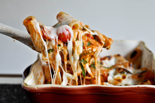 While pasta is cooking, heat tomato sauce over low heat in a large saucepan. Once warm, stir in heavy cream and grated parmesan. Once pasta is done cooking, drain and dump into the sauce, mixing to coat and turning off heat. Fold in mozzarella cubes and tomatoes, then chop 3-4 fresh basil leaves and add them in too. Once combined, spray a baking dish with non-stick spray and pour the entire pasta mixture into the dish. Top with fresh mozzarella rounds. Bake for 25 minutes, or until cheese is golden and bubbly.