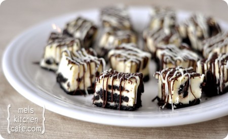 When the cheesecake is completely cooled, cover with plastic wrap and refrigerate for at least 2 hours. When chilled, remove the cheesecake using the foil overhang and cut the cheesecake into bite-sized pieces. Place the cheesecake bites on a wax or parchment paper-lined baking tray. Melt the semisweet chocolate and white chocolate in separate bowls (I use the microwave on 50% power, stirring frequently). Pour the melted chocolate into a ziploc bag, one for the semisweet chocolate, one for the white chocolate. Snip a small corner off the corner of the bag and drizzle the chocolate over the cheesecake bars. Chill the bars until ready to serve. Alternately, the drizzled bites can be frozen in an airtight container for up to a month. Let them defrost in the refrigerator and serve chilled.