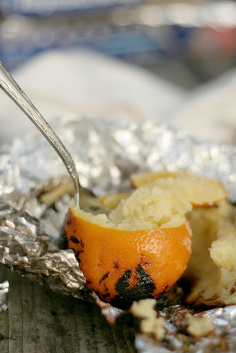 Fill the oranges up almost to the top with cake batter, and put the top back on. Carefully wrap in heavy duty foil, and throw it into the hot part of the fire.