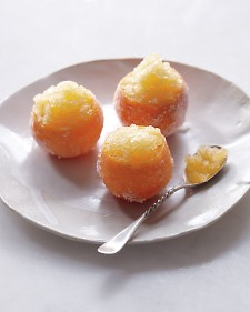Scrape granita with a fork to fluff. Spoon granita into clementine "cups." Freeze for 10 minutes before serving.