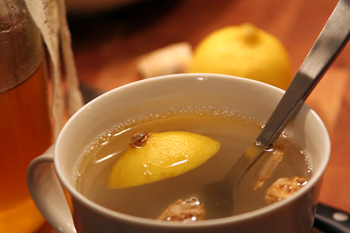 Bring the water and ginger to a boil, then lower flame, add the lemon (squeeze it into the water then drop the whole thing in) and keep at a low simmer for a few minutes. Pour into a mug and stir in the honey. Drink it in good health