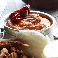2. Peel off and discard blackened skins along with stems and seeds from peppers. Coarsely chop peppers. Place eggplant and peppers in a food processor; cover and process with on/off turns until coarsely chopped. Or, for a chunky version, in a large bowl, mash eggplant and peppers with a potato masher or back of a large spoon. With a mortar and pestle, smash garlic with lemon juice, salt, and pepper. Add to eggplant mixture. Drizzle in olive oil, stirring constantly.