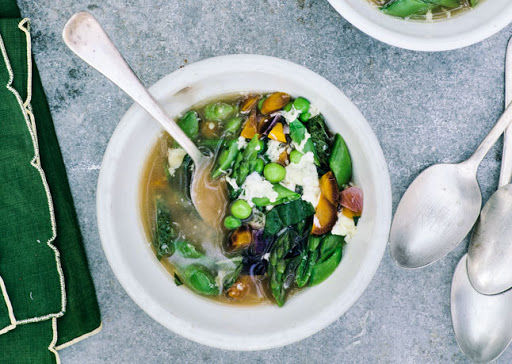 Add broth and bring to a boil. Add asparagus, sugar snap peas, and peas and cook until vegetables are crisp-tender, about 3 minutes.