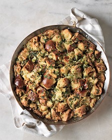 Combine bread, parsley, sage, and thyme in a large bowl. Melt butter in a large skillet over medium-high heat. Reduce heat to medium. Cook celery and garlic with a pinch of salt until celery is tender, 10 to 12 minutes. Add scallions and cook until tender but still bright green, about 4 minutes. Pour mixture into bowl with bread and stir. Let cool.
