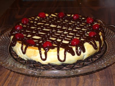 Bake in 350 degree oven for 55 minutes to 1 hour. (but start peaking at it at about 45 minutes). You know it's done when most of it is set but the center is still slightly wiggly. Cracks and brown spots will mean you over cooked it a little, but that will not affect the taste in the slightest. In fact, if you put chocolate or fruit on top, no one will know except you! (See, I have a few little brown spots in this picture, but it was still great!)