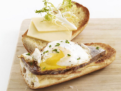Montar los bocadillos: Coloca dos mitades de pan en cada uno de 4 platos, encima poner un trozo de paté, un huevo, un poco de queso y cebolleta.