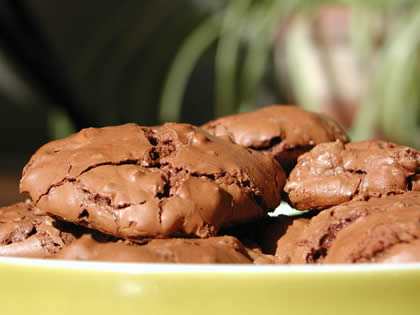 Beat eggs at high speed until foamy. Gradually add sugar, 1 tbsp. at a time, beating until mixture is thick and lemon colored (about 5 minutes). Add chocolate mixture and next 4 ingredients, mixing well. Stir in vanilla. Drop by teaspoonfuls 3 inches apart on greased cookie sheets. Press a walnut half into center of each cookie. Bake at 350 degrees for 8-10 minutes. Cool on wire rack.
