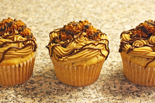 14.Frost with caramel coconut frosting, drizzle with melted chocolate and top with ½ a Samoa cookie.