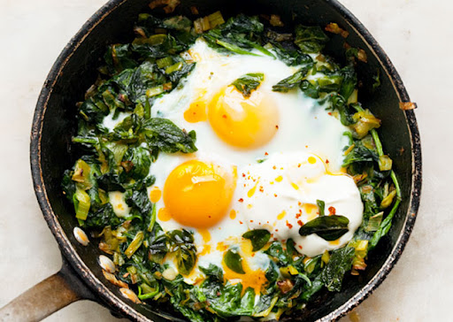 Elevate eggs to a different realm by flavoring spinach with melted leeks and scallions, baking eggs on top, and finishing with a dollop of yogurt and a drizzle of butter spiced with a smoky Turkish chili powder known as kirmizi biber (though crushed red pepper flakes will also work). Special weekend breakfast or brunch.