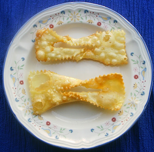 14. Make a slit in the middle of the 6 1/2 inch long strip of dough, then pass one of the ends of the strip through the slit and catch it on the other side. The end result show look like a man's bow tie (rather than a knot). [If one is making rose-wheeled shaped caragnole one folds up the strip of dough and makes small pockets by pinching the dough about every 3/4 of an inch, and then rolling up the dough round itself.]