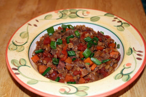 I have no idea what's got me in the mood for lentil soup. Perhaps the cold front that's come through this weekend and put temps back in the 50s. I'm sure this is the last hurrah of comfortable weather before "spring" (AKA 80+ temps) arrives for good in Mississippi. C'est la vie. I'm a weirdo for my state. I love cold weather. Anyway, I have never really made a lentil soup before. I mean, sure, I've added lentils to other soups in a sort of "everything but the kitchen sink" fashion, but I've never made a soup where lentils were the star of the show. Not sure why I picked them today, except that it's Sunday, and I've got lots of work to do to catch up on grading in my classes, so I wanted something simple, easy, and filling that I didn't have to babysit. Of course, that means crock pot. I perused a bunch of lentil soup recipes across the 'net this morning, but nothing quite hit the right chord with me, so I wound up taking elements from all of them and making this up, largely out of stuff from my freezer, which was full to bursting and needed thinning out.