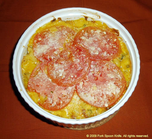 Pour mixure into a 2 quart casserole. Arrange tomato slices on top and sprinkle parmesan cheese. Distribute the remaining 1 T of butter over the slices. Bake in the oven for 30-35 mins until the top is browned and the sauce is bubbling.