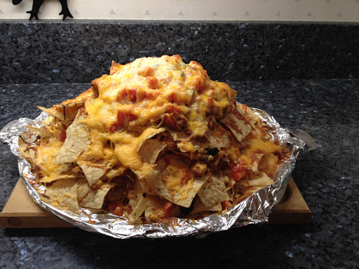 4. Begin to layer, start with nachos, chicken mixture,ground turkey or Pork, bacon, tomatoes,green onions, black olives, jalapenos (if using) ,and cheese. Repeat to create your mound, add lots of cheese on the very top to cover your mound. Bake for 15 to 20 minutes till all the cheese is bubbling and melted. Serve with Salsa, Sour Cream and more jalapenos on the side.